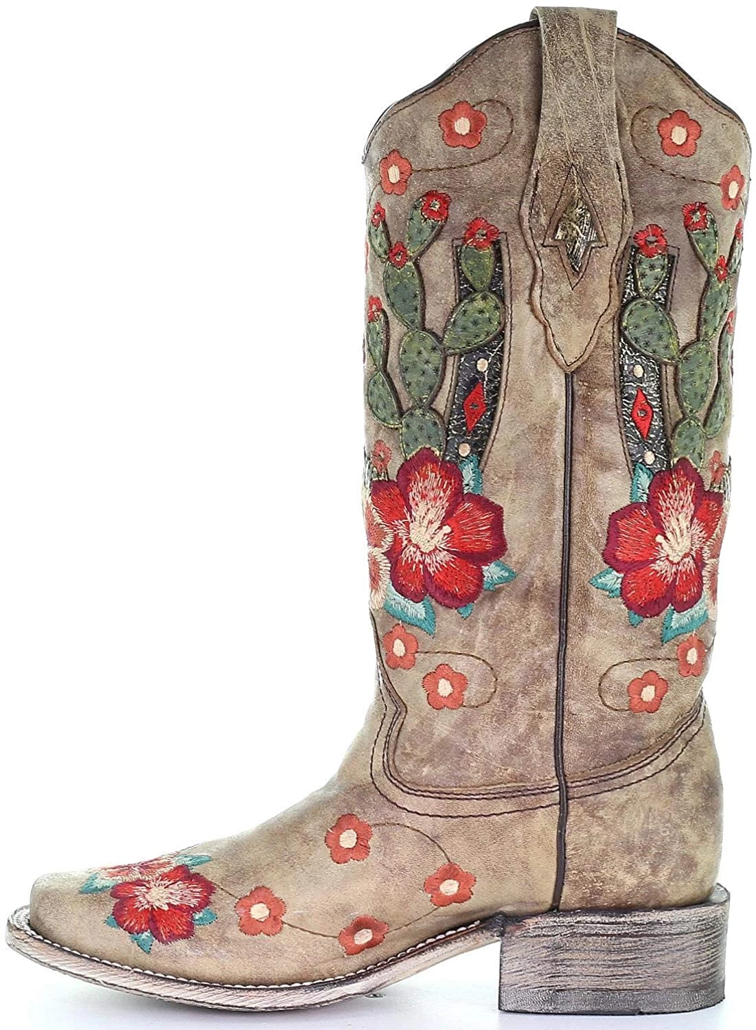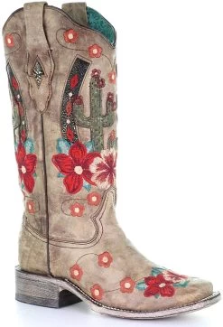 Taupe Western Boot with Horseshoe, Cactus and Floral Embroidery.