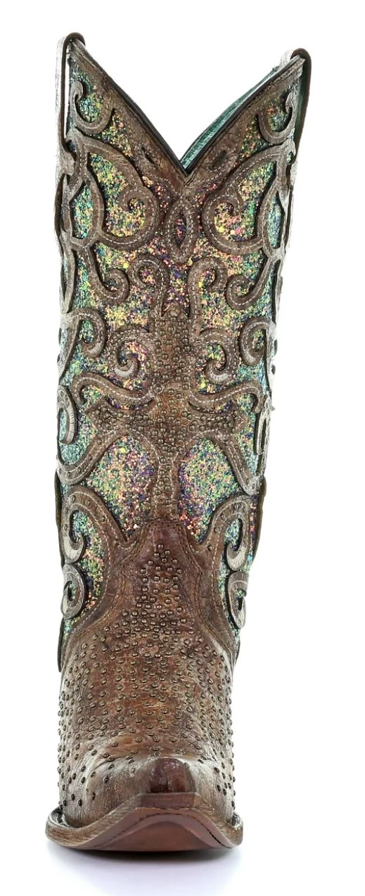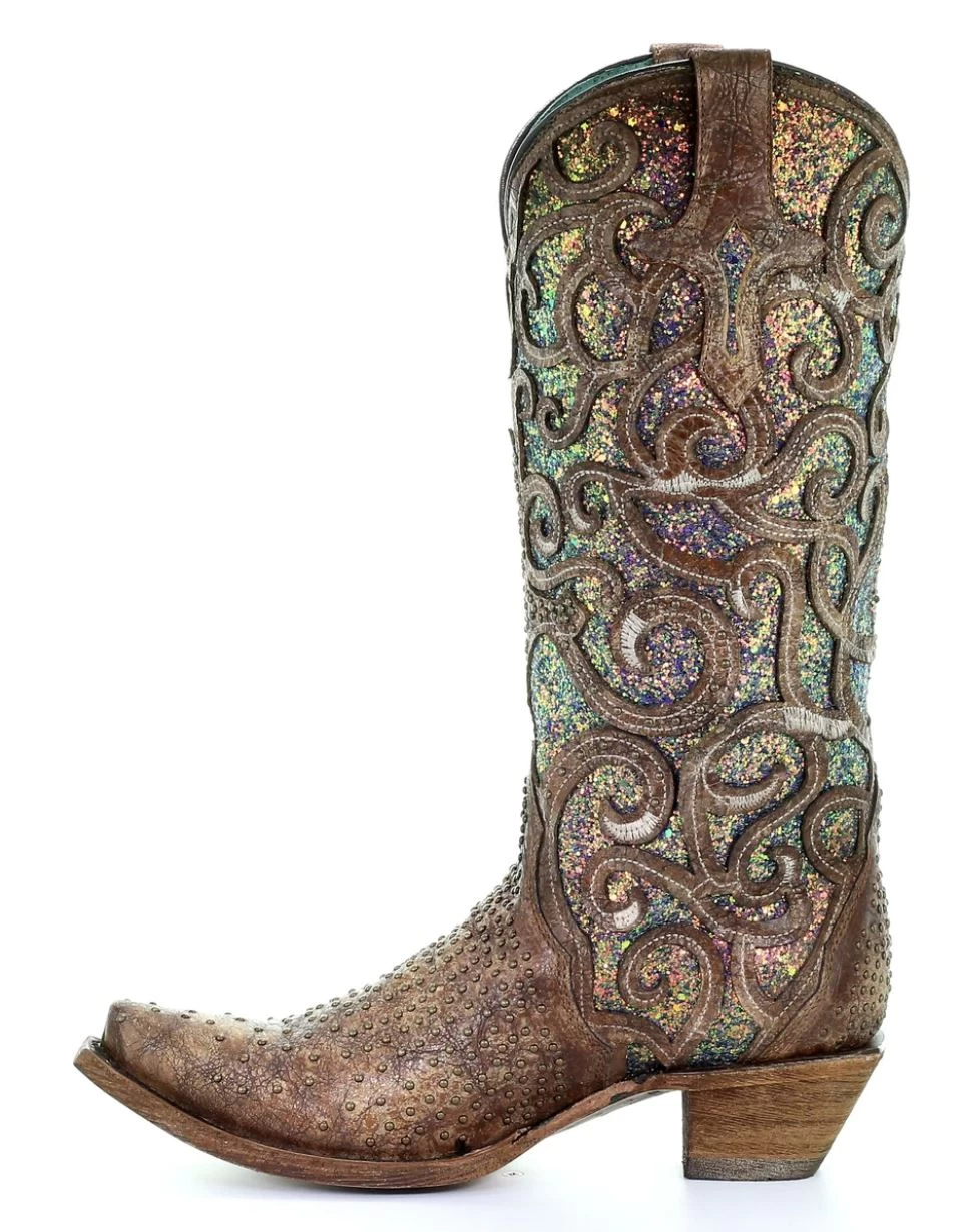 Cognac Western Boot with Purple Glitter Inlay and Bronze Stud Detail.