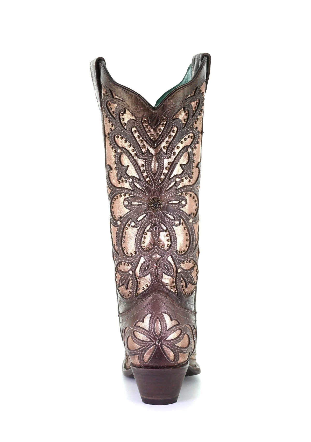 Brown Snip Toe Western Boot with Rose Gold Inlay and Rhinestone/Stud Detail.