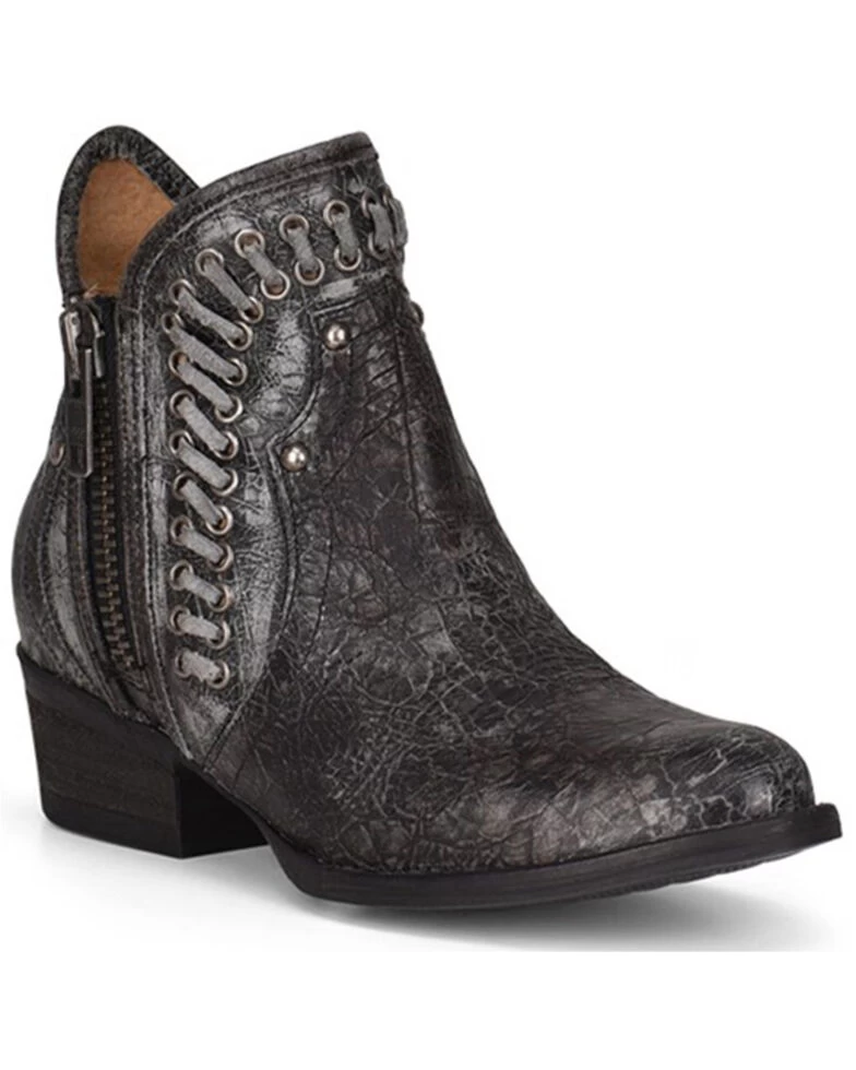 Distressed Black Studded Western Bootie with Lace Detail.